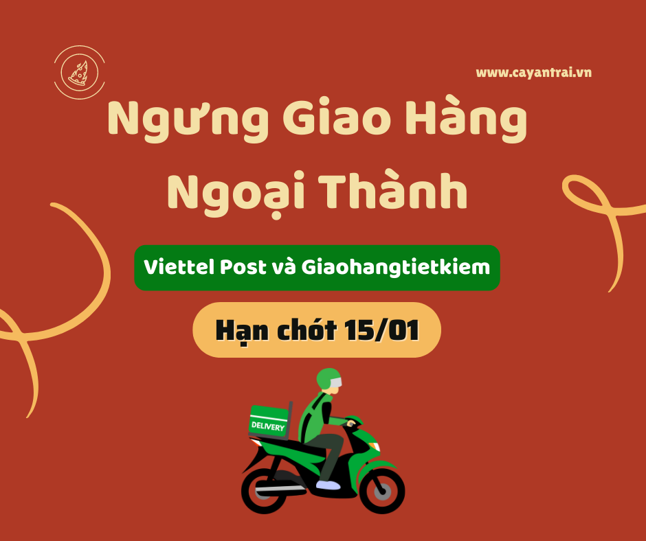 Vì đơn vị Viettel Post và Giaohangtietkiem NGƯNG NHẬN HÀNG TỪ NGÀY 15/01, các ĐƠN HÀNG TỈNH LẺ SẼ KHÔNG VẬN CHUYỂN ĐƯỢC sau ngày này. Quý khách hàng khu vực ngoại thành TP.HCM mua cây cần đặt trước ngày này để thu xếp giao hàng kịp thời. Trong thời gian làm việc, các đơn hàng NỘI THÀNH TP.HCM VẪN GIAO NHẬN BÌNH THƯỜNG.