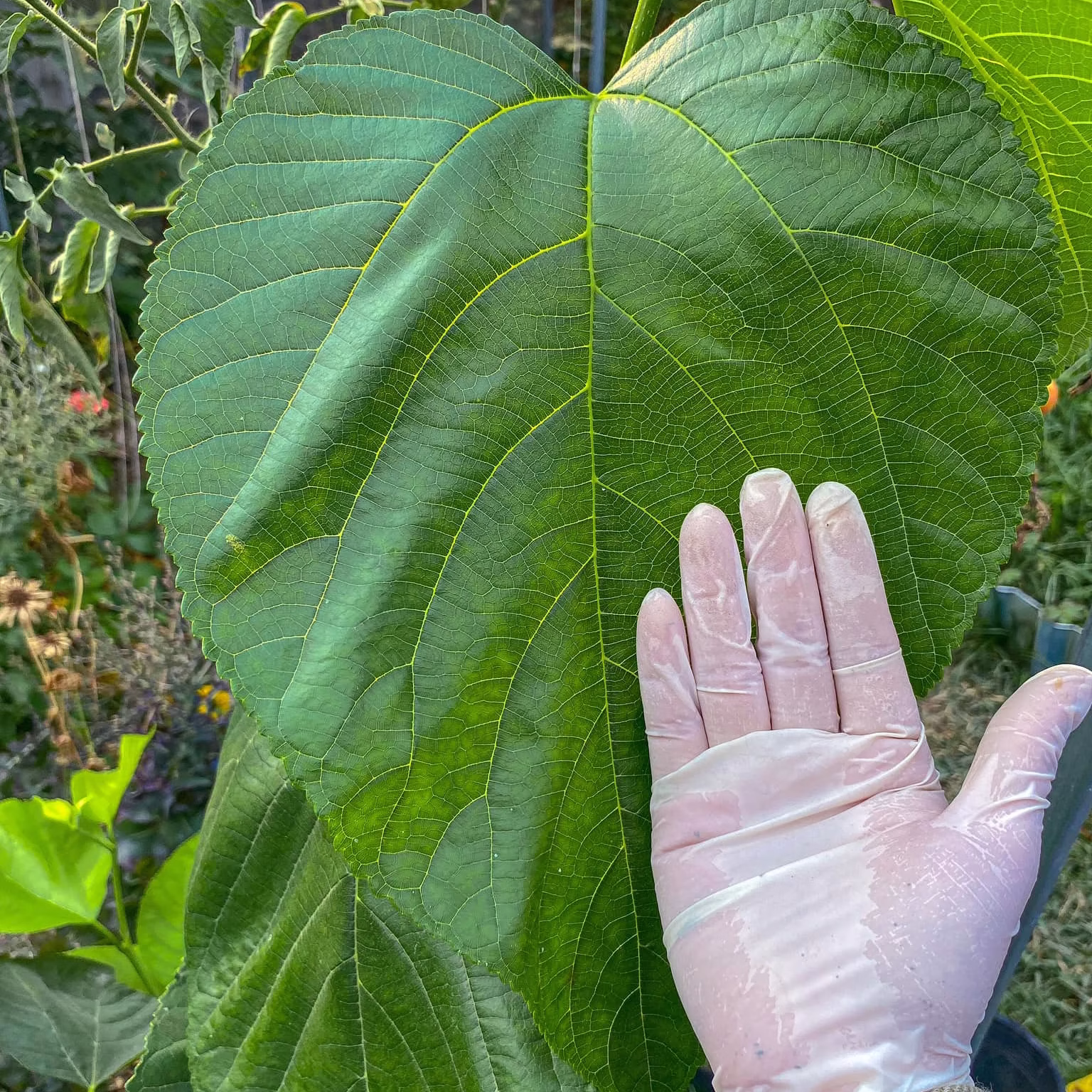 - Lá: lá có hình trái tim, viền lá có răng cưa, màu xanh đậm. Kích cỡ lá lớn nhất có thể đến 40cm.