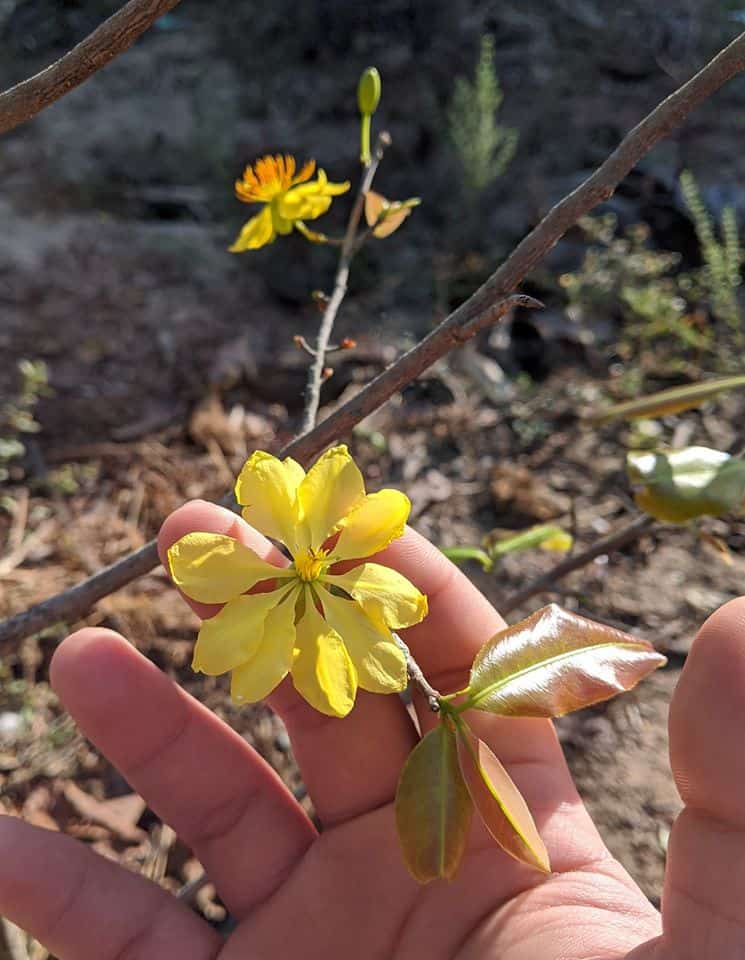 – Mai kem quê nhà Hoàng Long còn gọi là Mai Sữa, hoa màu vàng sữa, số cánh thông thường chỉ 5 cánh, vì cánh ít và thưa nên người ta không trồng, chỉ để mọc hoang dại. Riêng cây này hơi lạ lên đến 10 cánh, hoa đẹp hơn. Có thể do Đột biến trong quá trình thụ phấn chéo. Thôi thì thiên nhiên ưu đãi nên ta cứ để trồng