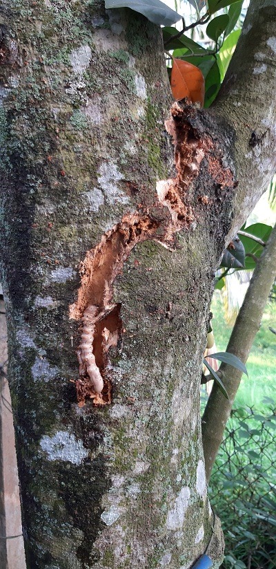 Đây là căn bệnh rất thường gặp ở cây trồng như cây xoài, mít,… Rất khó phát hiện triệu chứng gây hại của ấu trùng đục thân, bởi vì nó thường đục bên trong thân cây, đường đục sẽ lớn dần theo tuổi của ấu trùng và phải quan sát kỹ cây mới phát hiện thấy qua các lỗ đục làm thân cây héo khô và có thể chết.